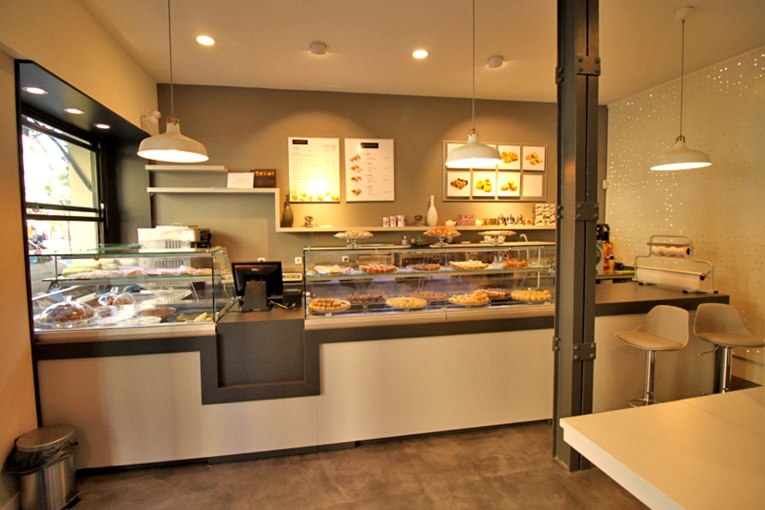 Nuestra actuación en este proyecto sigue dos líneas: conseguir un ambiente acogedor y moderno y dar visibilidad al local, que es un semisótano, desde la calle.