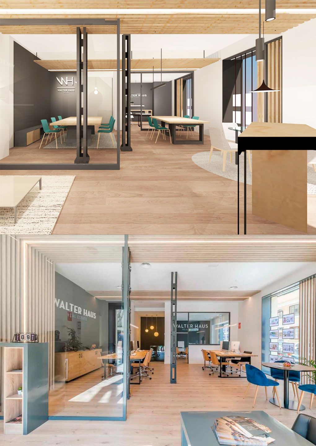 En las imágenes superiores observamos las similitudes entre el render y el resultado final en dos ejemplos de reformas de locales comerciales llevadas a acabo por el estudio de arquitectura e interiorismo ARKin en la ciudad de Madrid.