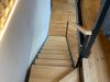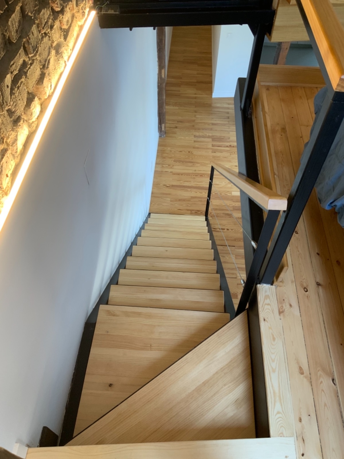 Cabe destacar también la mezcla de diferentes materiales que existen dentro de la vivienda. Cada material representa una época de la vivienda distinta y desde ARKin creemos que lo interesante era conjugar estas diferentes épocas añadiendo una nueva materialidad que no sustituya las anteriores, sino que las complemente. Así pues, encontramos una estructura de madera antigua, tratada y reforzada cuando ha sido necesario con acero. Además utilizamos una madera en tono más claro para diferenciarse de la antigua, también encontramos nuevas estructuras de acero y una pared donde preservamos el ladrillo antiguo, realizando un contraste entre la planta baja y la planta primera.