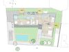 En la planta baja encontramos un cerramiento de vidrio que abre la casa hacia la piscina y el jardín, aprovechando los esquinazos y quiebres de la vivienda. El sol ilumina naturalmente el jardín, la piscina y penetra en la casa. En esta planta encontramos un gran salón con comedor y cocina en un gran espacio diáfano y una parte, más privada, al fondo de la vivienda, donde se proponen, un espectacular dormitorio principal y dos dormitorios adicionales, todos con sus respectivos vestidores y baños en suite.
