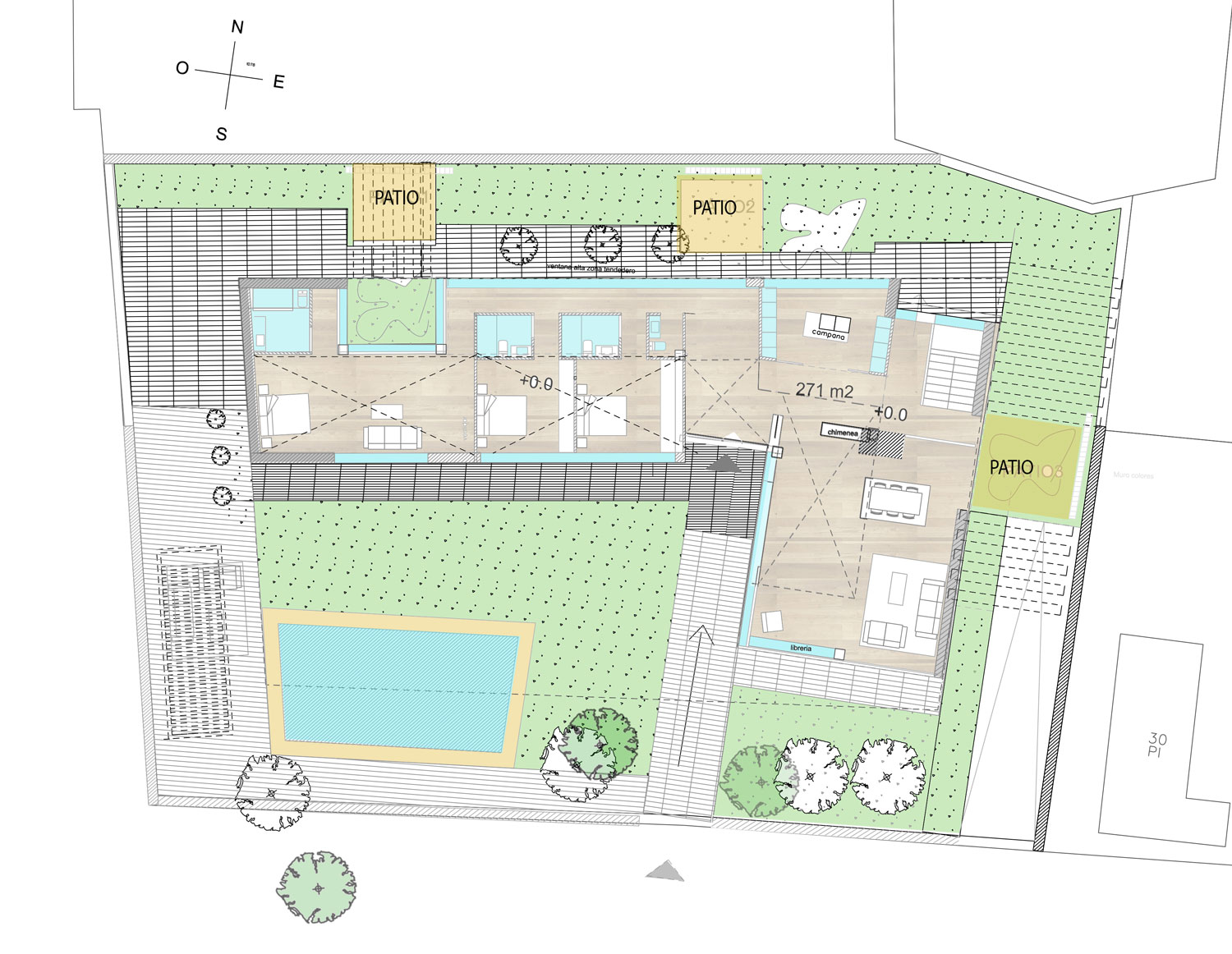 La vivienda proyectada consta de 387 m2 de superficie construida, repartidos en una planta baja de 271 m2, que se abre a 3 diferentes patios que nos remiten a la arquitectura de Barragán, una planta primera con 116 m2 y un garaje bajo rasante de 100 m2.