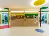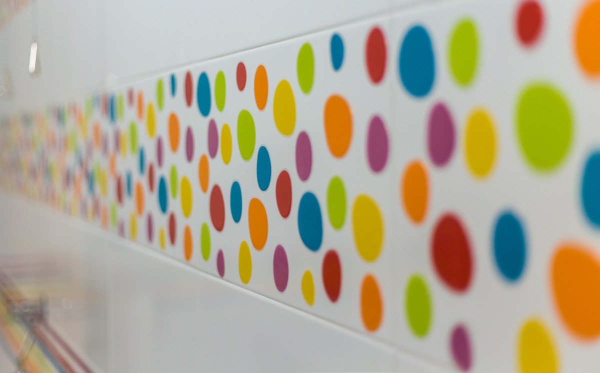 utilizar para distintas actividades. Los baños infantiles tienen azulejos de puntos y rayas de Ágata Ruiz de la Prada, con una linea divertida de colores primarios.