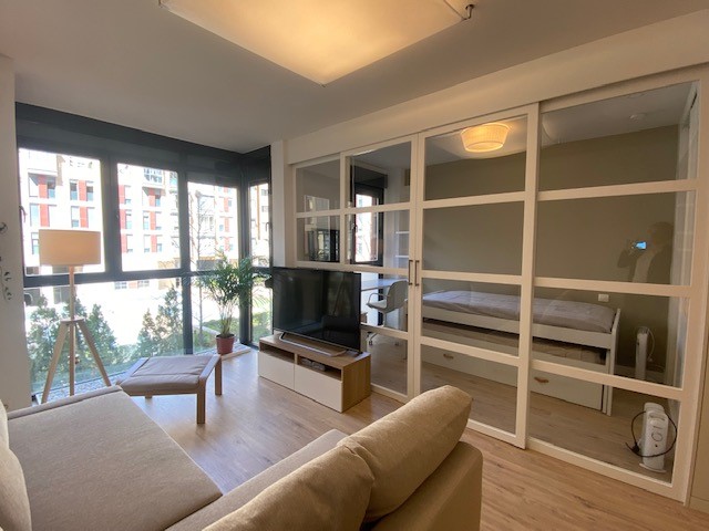 Para ello se utilizan paneles correderos entre la habitación y el espacio del salón, se juega con estores interiores que gradúen la privacidad y se elige un mobiliario polivalente.