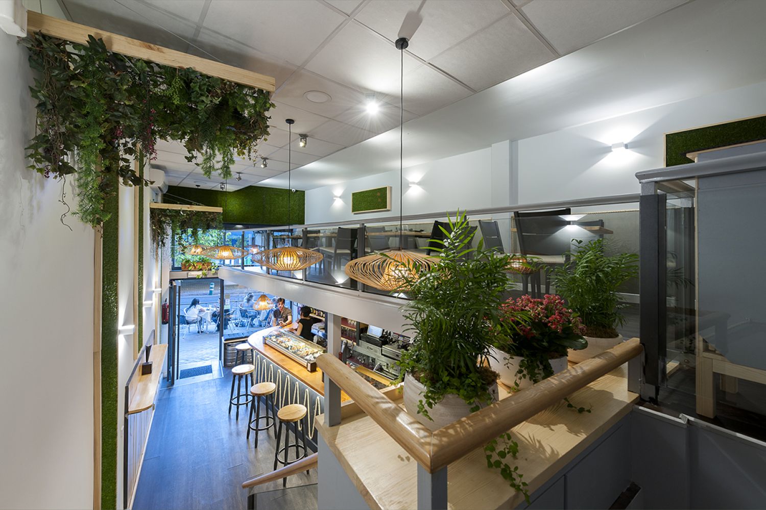 Nuestra actuación en este proyecto sigue dos líneas: conseguir un ambiente acogedor y moderno y dar visibilidad al local, que es un semisótano, desde la calle.