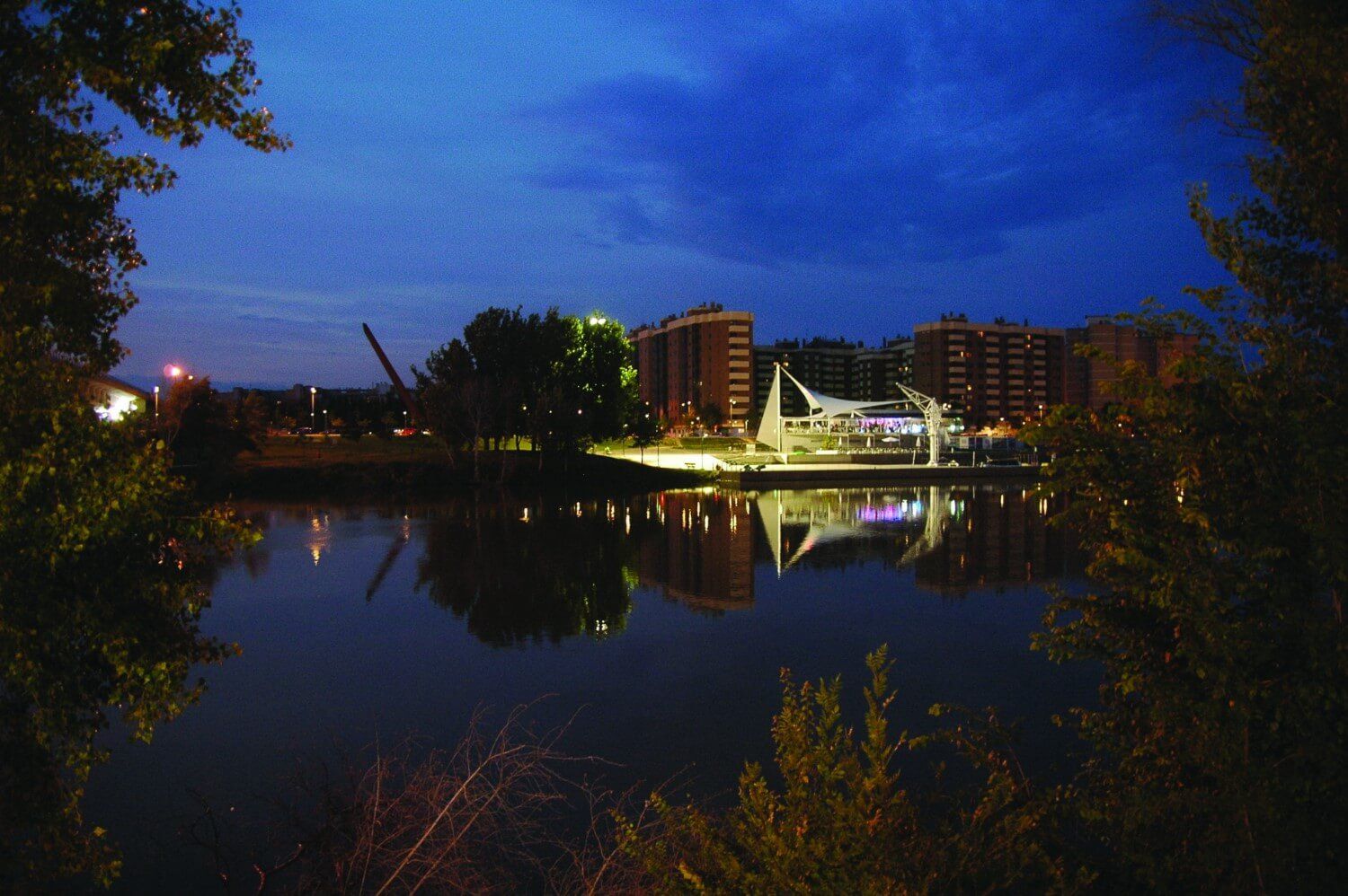 Por la noche, su reflejo en el agua parece un navío remontando plácidamente el Ebro.