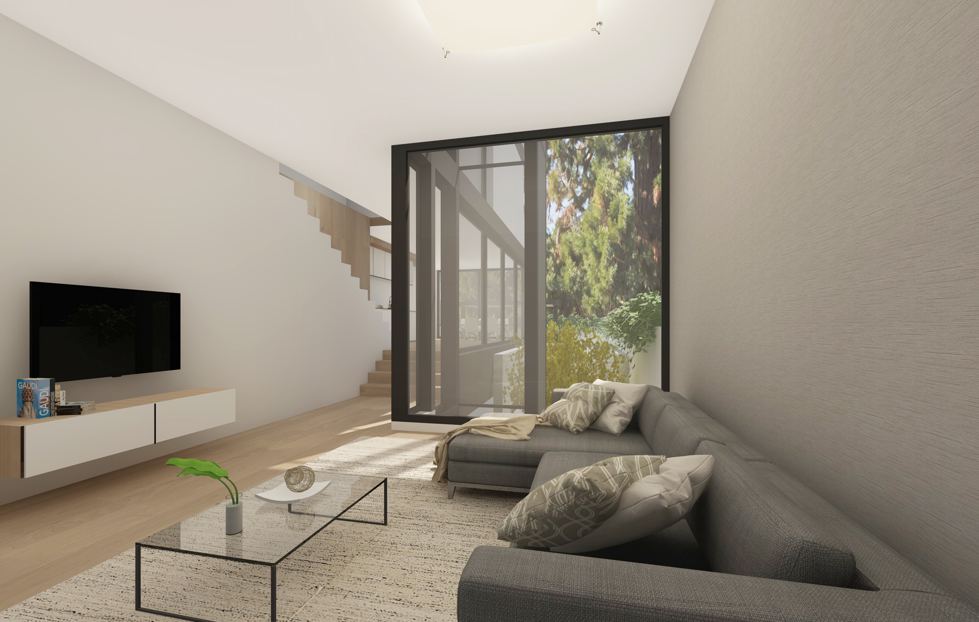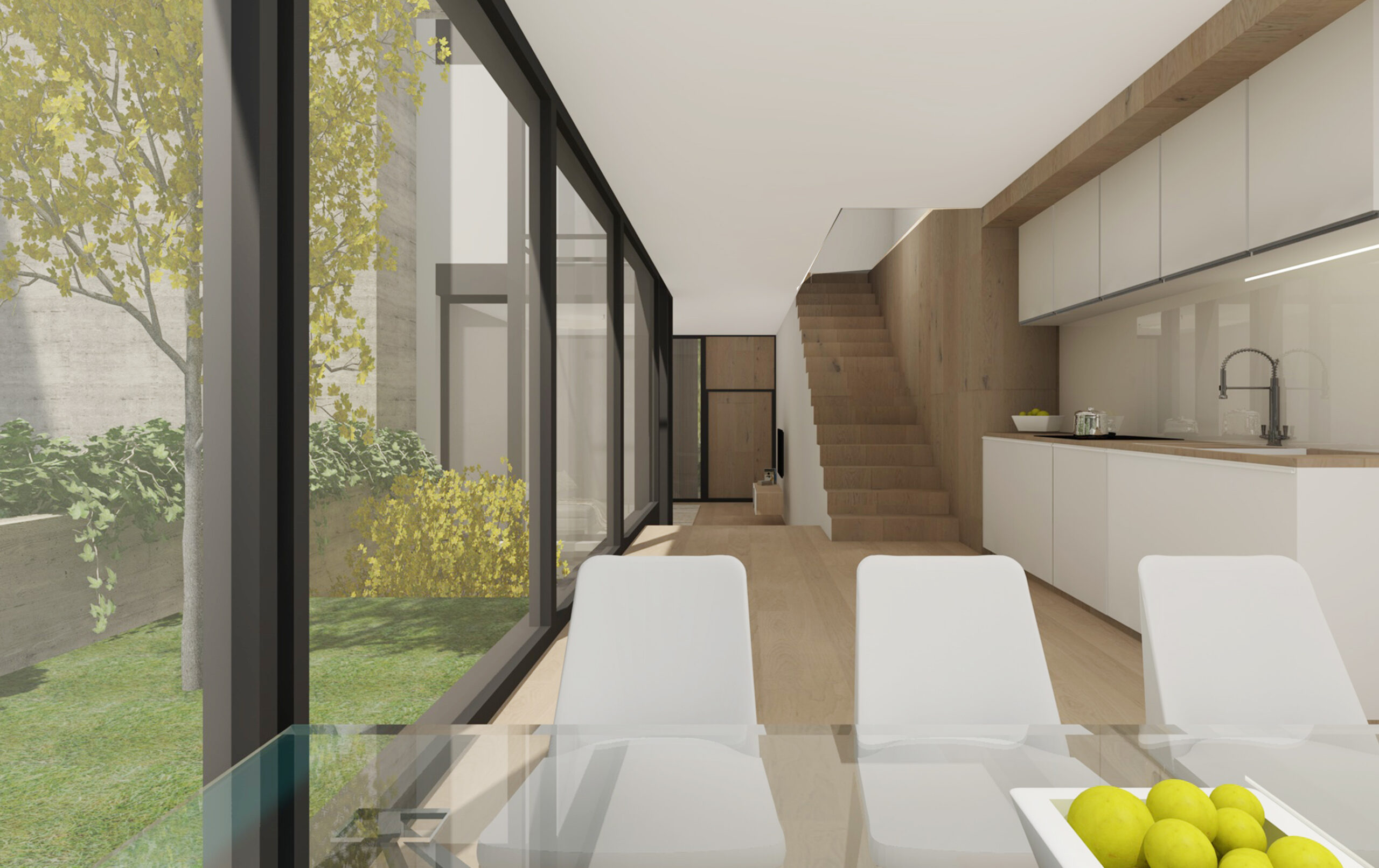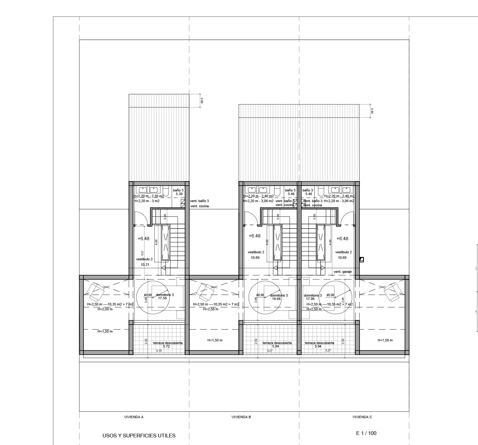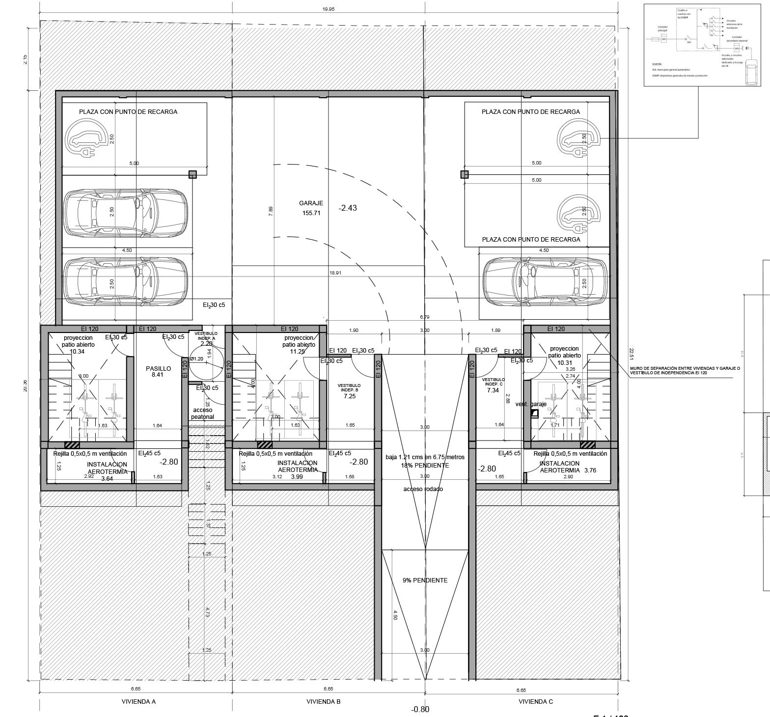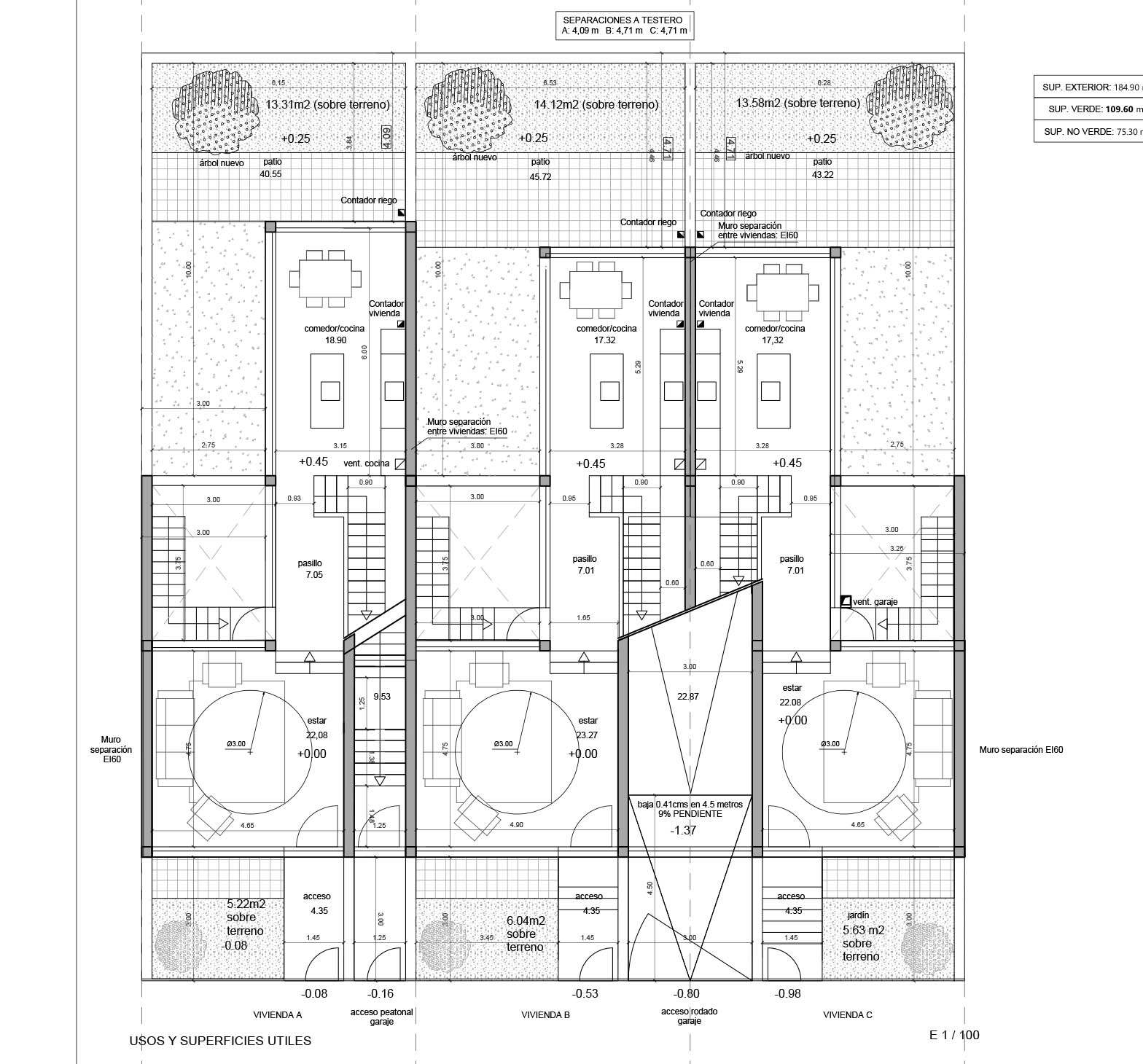 Se diseñan 3 viviendas pareadas de 170 m2, cada uno sobre una parcela de 150 m2. Las viviendas cuentan con un garaje común, además de jardín individual. Las viviendas tienen 2 plantas + ático sobre rasante y una planta sótano. Jardín delantero de 10 m² y jardín trasero de 45 m² aproximadamente. El proyecto contempla Aerotermia para la calefacción y el agua cliente, con depósito de acumulación y calefacción invisible por suelo radiante.