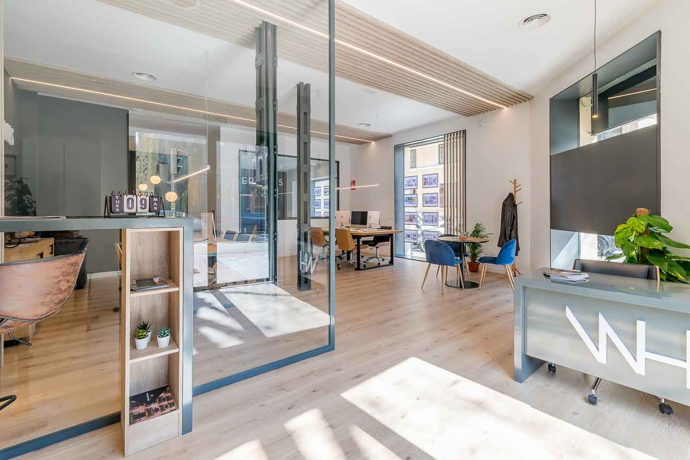 ARKin recibe el encargo para reformar el local comercial de la inmobiliaria Walter House, en el barrio de Chamberí (Madrid). Se trata de realizar una reforma que convierta al propio local en un escaparate para atraer clientes, proponiendo una imagen seria y acorde a nuestros tiempos. Se persigue mantener la fluidez espacial separando la planta en distintos ambientes de trabajo mediante elementos de vidrio.